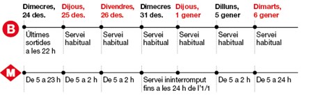 - Per Cap d’Any el metro funcionarà tota la nit, mentre que demà, dimecres 24 de desembre, vigília de Nadal, tancarà a les 23 hores