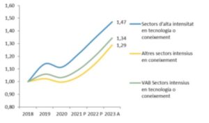 - De l’estudi es desgrana que la riquesa (VAB) dels sectors intensius en tecnologia o coneixement ha crescut un 34% des de 2018, mentre que el de la resta de l’economia s’ha incrementat un 13%