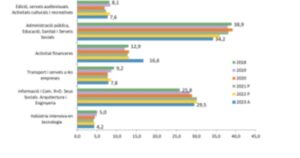Els sectors que han guanyat més participació els darrers cinc anys són el dels serveis d’alta intensitat en coneixement (d’Informació i Comunicació. R+D, Seus Socials. Arquitectura i Enginyeria) i el d’Activitats financeres, ambdós amb 3,7 punts percentuals més que el 2018. I el que ha reduït el seu pes de forma significativa és l’Administració Pública, Educació, Sanitat i Serveis socials (-4,7 punts).