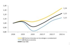 - De l’estudi es desgrana que la riquesa (VAB) dels sectors intensius en tecnologia o coneixement ha crescut un 34% des de 2018, mentre que el de la resta de l’economia s’ha incrementat un 13%