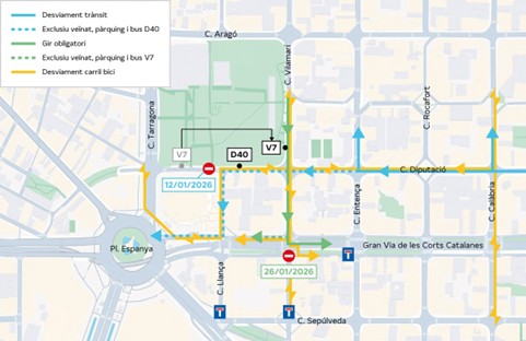 - El trànsit es desviarà pels carrers d’Entença i de Calàbria cap al d’Aragó fins al de Tarragona per poder arribar a la plaça d’Espanya.