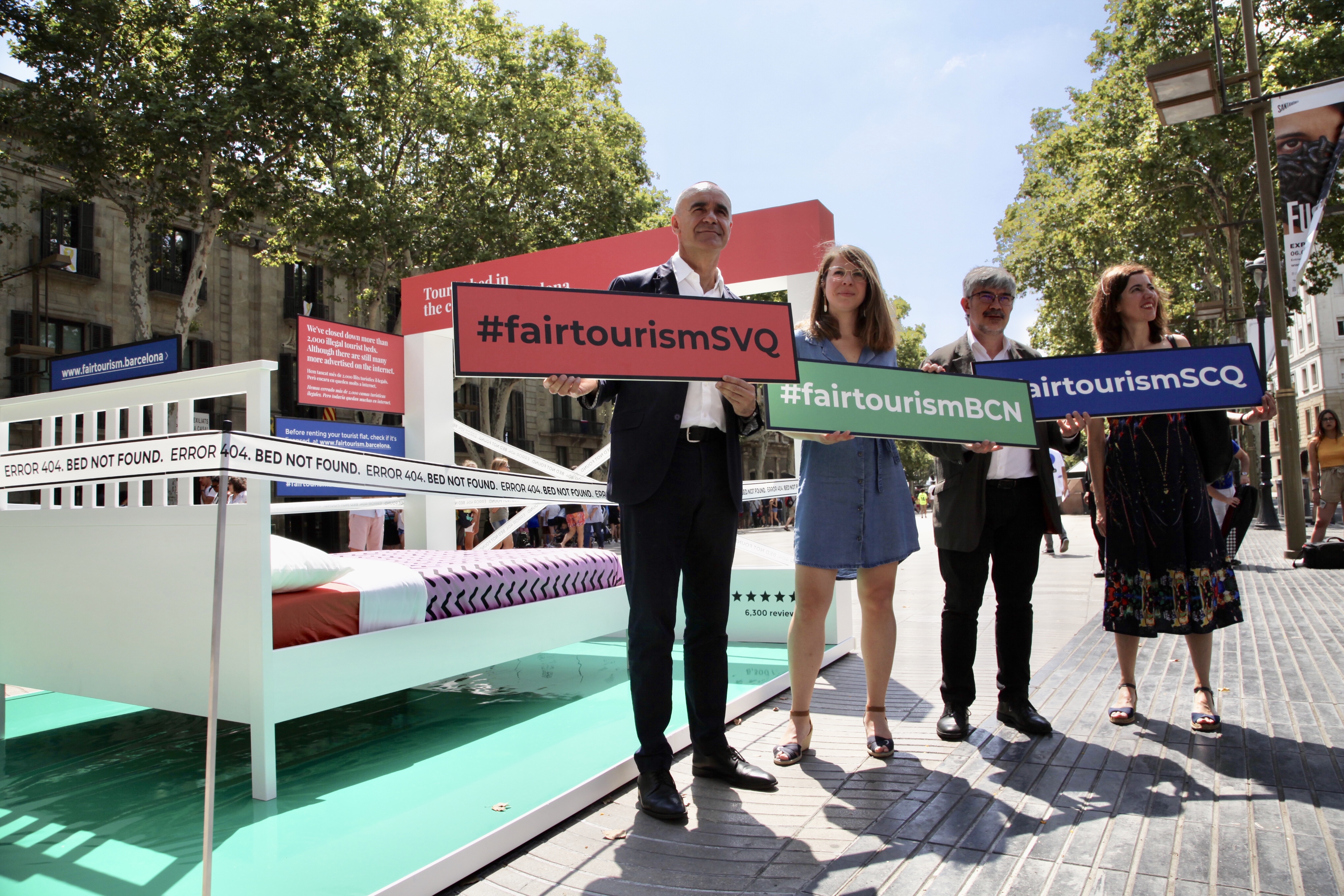 Abans de la roda de premsa, han inaugurat la segona edició de la campanya de conscienciació ciutadana a favor d’un turisme just i contra l’allotjament turístic il·legal. Enguany, es comparteix amb els Ajuntaments de Sevilla i Santiago de Compostela, que la desplegaran a les seves ciutats.