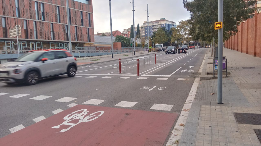 Avui s’ha posat en marxa el nou tram de carril bici de la Gran Via de les Corts Catalanes, entre el carrer de Mossèn Amadeu Oller i la plaça d’Ildefons Cerdà, al districte de Sants-Montjuïc.