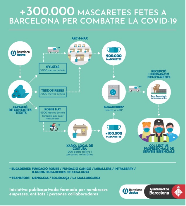 L’Ajuntament de Barcelona, a través de Barcelona Activa, ha posat en marxa una cadena de producció pròpia de mascaretes amb l’objectiu de ser menys depenents dels Mercats exteriors i a la vegada per aprofitar el potencial del teixit econòmic de la ciutat.