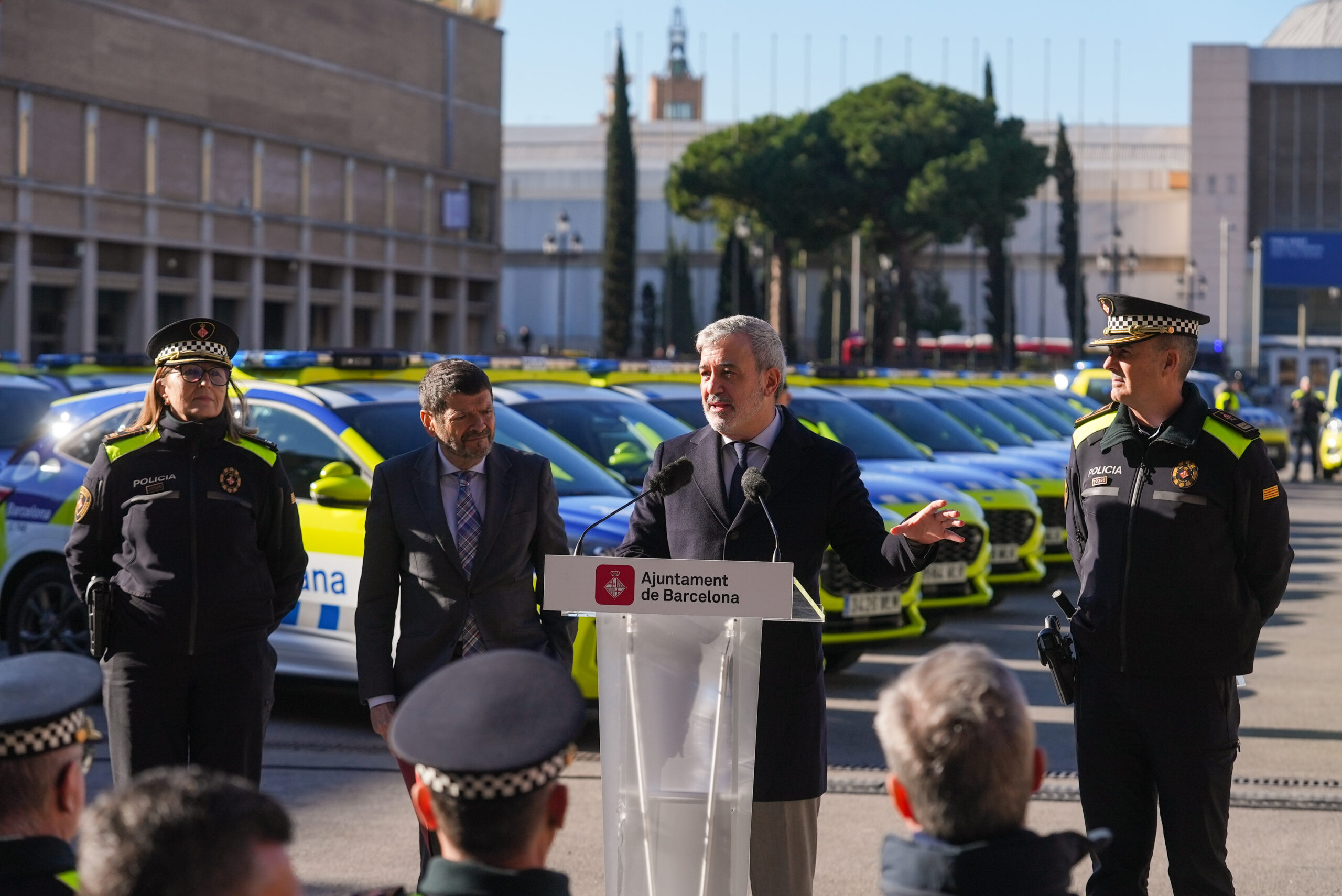 L’alcalde de Barcelona, Jaume Collboni, ha presentat avui el nous vehicles de la Guàrdia Urbana acompanyat pel tinent d’alcalde Albert Batlle i pel Cap de la Guàrdia Urbana, l’Intendent Major Pedro Velázquez.