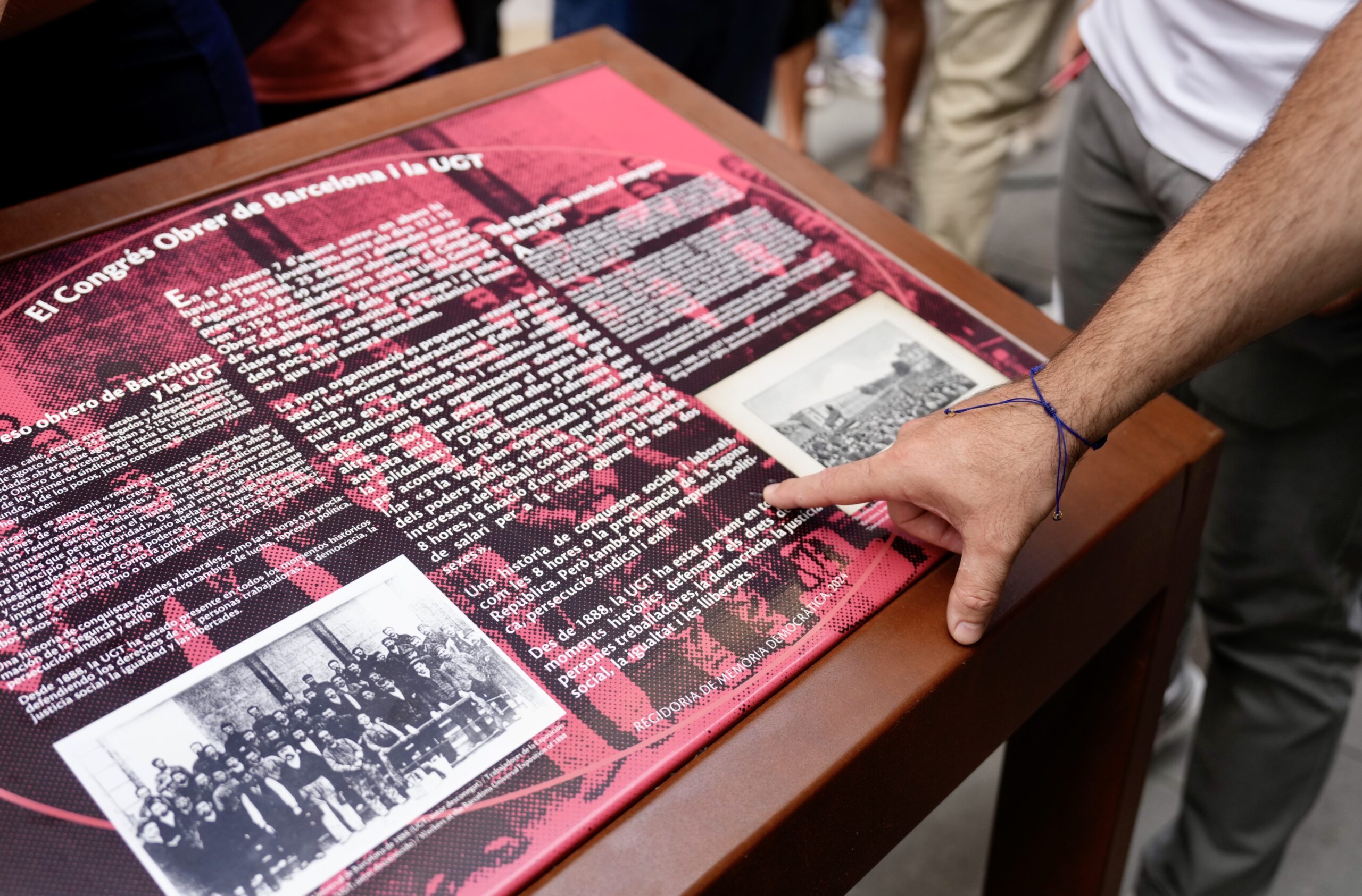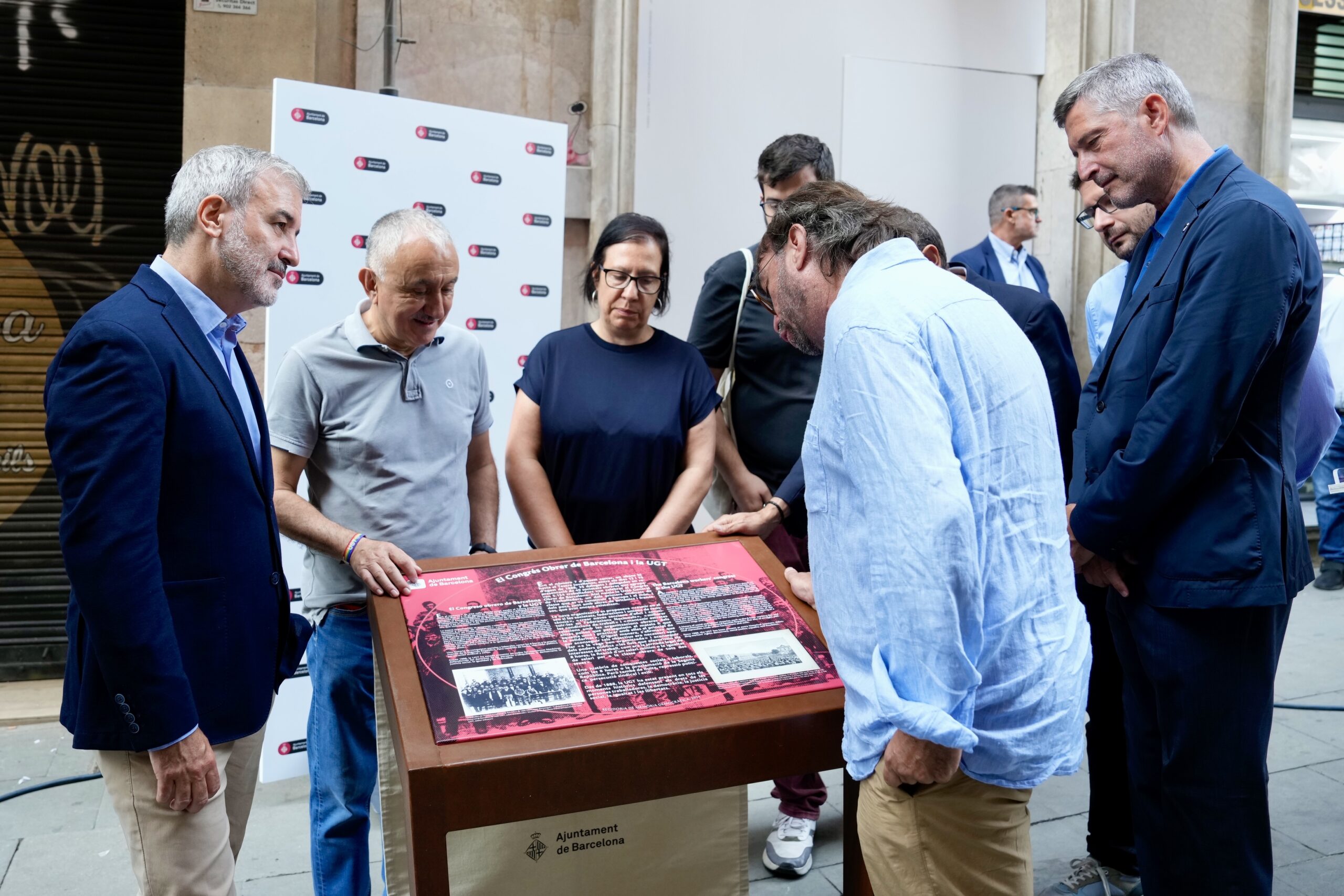 L’alcalde de Barcelona, Jaume Collboni, el secretari general de la UGT, Pepe Álvarez, el secretari general a Catalunya, Camil Ros i la regidora de Memòria democràtica, Raquel Gil han participat en l’acte de descoberta del faristol de memòria dedicat al sindicat UGT al carrer Jovellanos, 7.