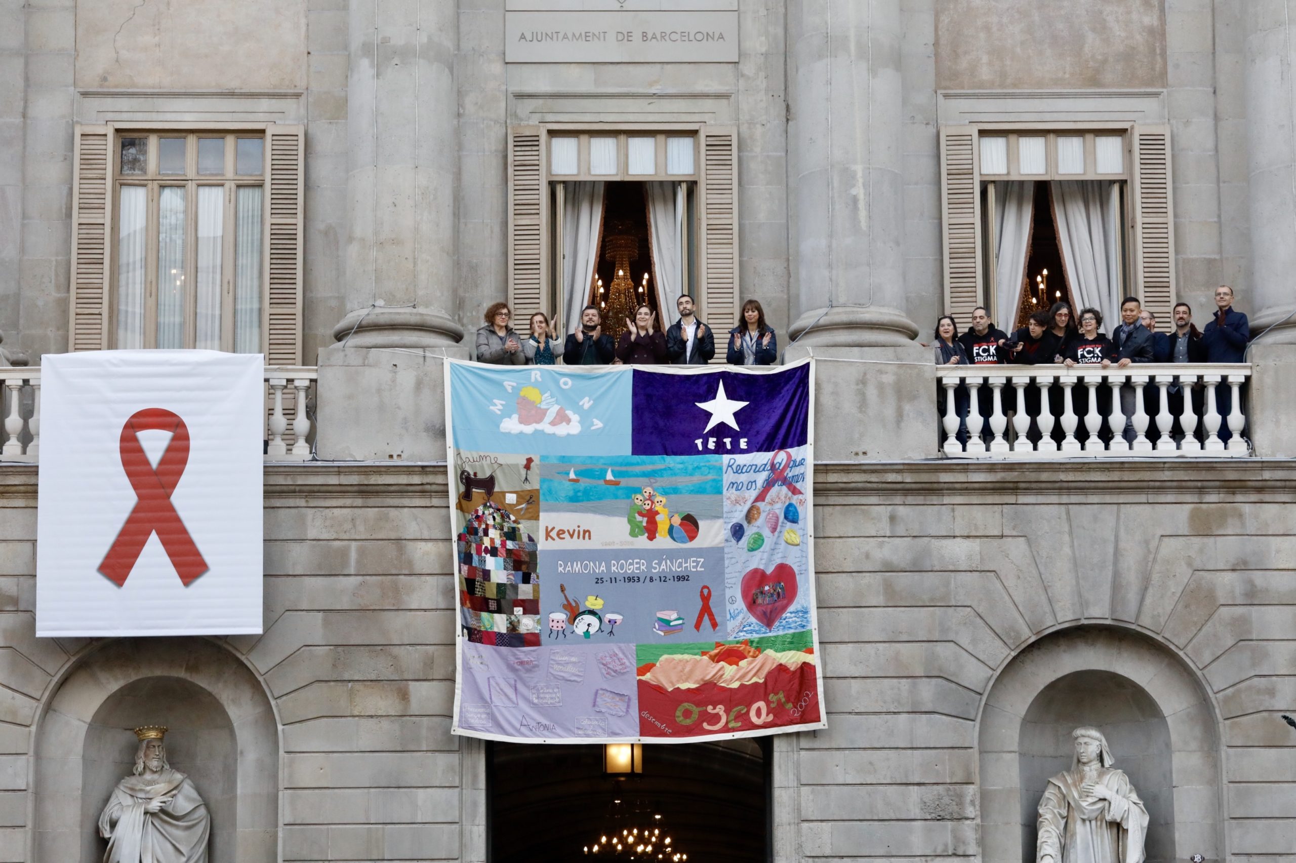 Barcelona desplega el Tapís Memorial de la Sida des del balcó de l’Ajuntament