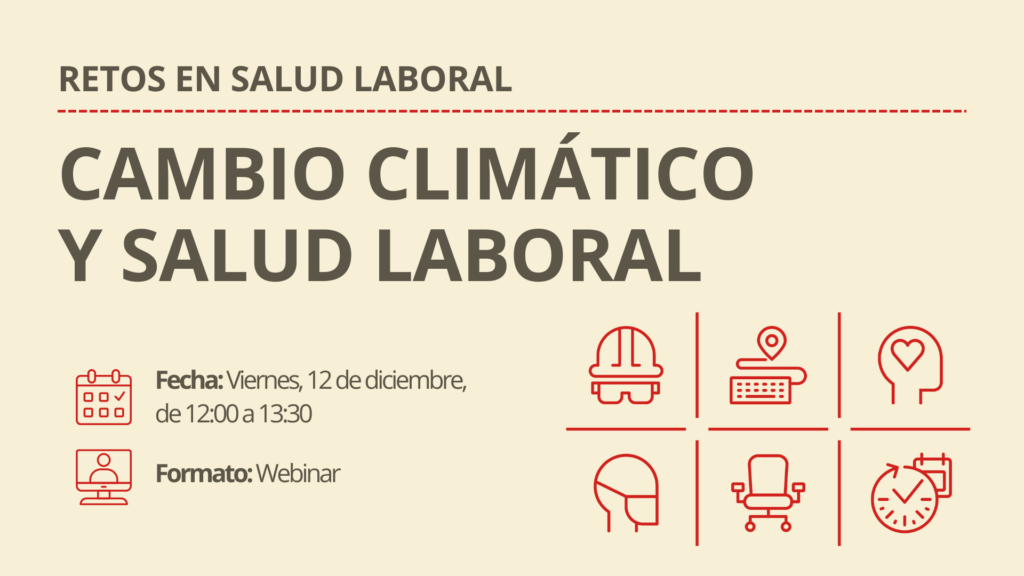 Salud Laboral. Nueva sesión del ciclo “Retos en Salud Laboral” dedicada a los efectos del cambio climático en la salud laboral. El seminario web tendrá lugar el 12 de diciembre y contará con expertos en prevención, investigación y gestión municipal.