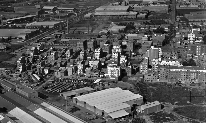 Vista de la barriada a mediados de la década de 1960. Se puede apreciar la transformación de las casitas de una planta en edificios de cuatro o más plantas (c) ICGC
