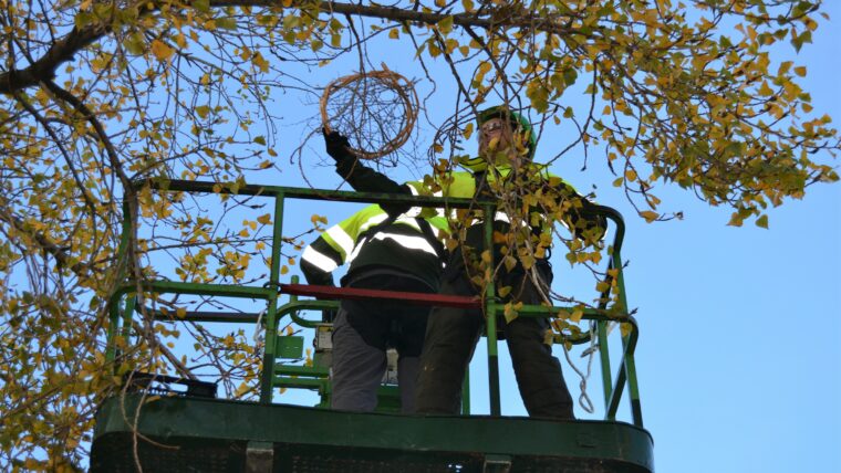 Durant la jornada de seguiment, també es va col·locar una caixa niu per a xoriguer comú i es va construir i col·locar una plataforma feta a base de brancatge per al repòs dels bernats pescaires que freqüenten el parc. Aquestes dues estructures s’han ubicat respectivament en els dos eucaliptus de gran port propers al llac gran del parc. Per últim, es van retirar els nius vells per evitar el col·lapse de la caixa i permetre la nidificació durant la propera temporada de cria.