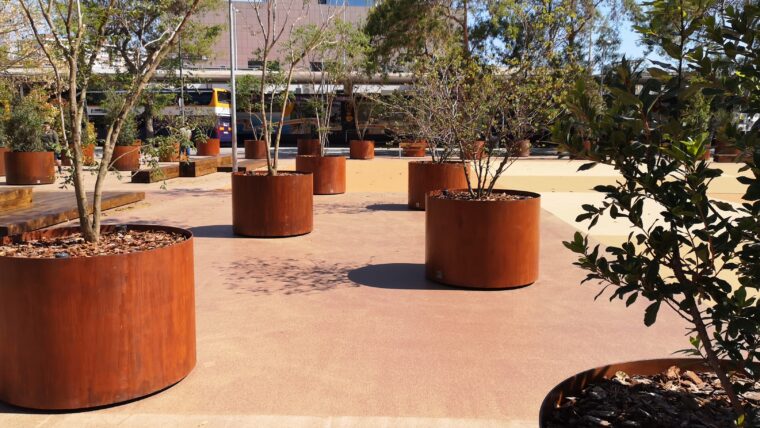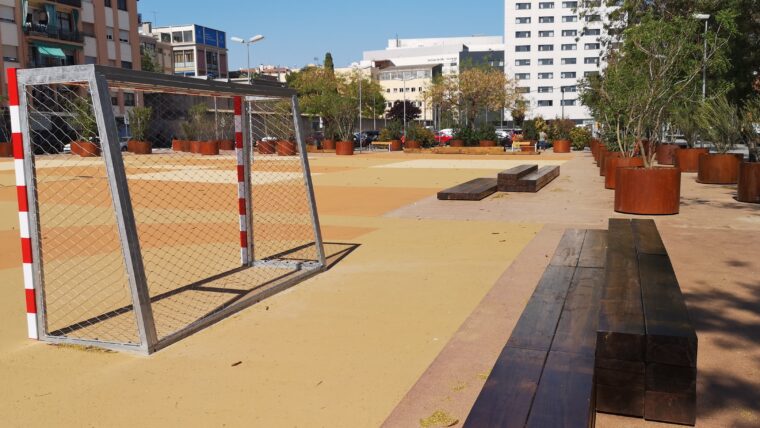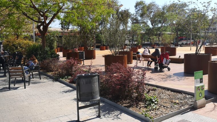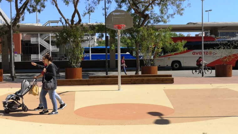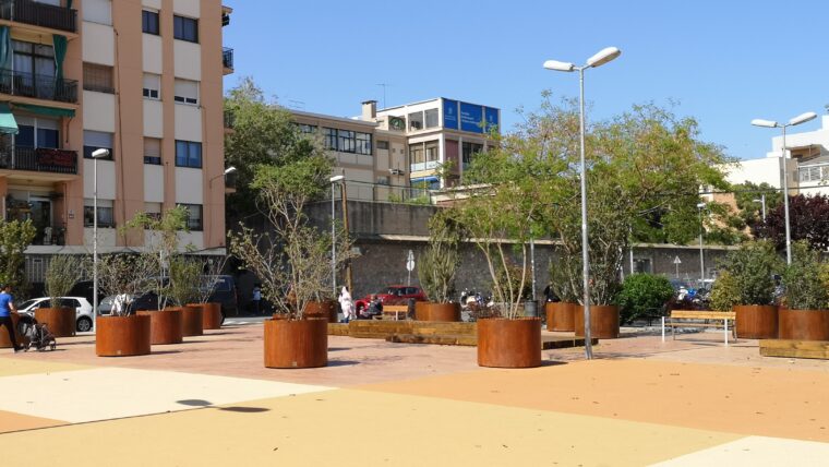 Ha estat una reurbanització tàctica, és a dir, sense aixecar-ne el paviment sinó repintant-lo, i col·locant-hi tot un seguit d’elements que incrementen la quantitat i la qualitat de l’espai públic i del verd urbà. Com a elements multiesportius per fer-hi activitats a l’aire lliure, hi ha tres taules de ping-pong, una cistella de bàsquet i una porteria de futbol. L’espai central s’ha pintat amb altres jocs a terra, però queda lliure per a l’escenari que habitualment hi instal·len, per exemple, els Castellers de Sants durant la Festa Major. Tot al voltant hi ha petites graderies de fusta, bancs i una cinquantena d’arbres, disposats en hidro-jardineres. També una font d’aigua i diverses papereres. Els mateixos arbres es podran plantar directament a terra quan es reurbanitzin definitivament tots els entorns de l’estació de Sants. El punt de recàrrega de vehicles elèctrics s’ha traslladat a l’aparcament de l’altra banda del carrer de Guitard.