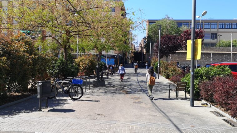 Feia temps que aquesta part de l’esplanada i aparcament de motos de l’illa compresa entre els carrers de Puiggarí, Guitard, Viriat i Comtes de Bell-lloc, on hi ha també l’antiga fàbrica dels Germans Climent, es feia servir més aviat com a lloc de pas i espai de jocs per a les famílies, sobretot de l’Escola Pràctiques que queda just al davant, al carrer de Guitard. De fet, la Plataforma Stop Tanatori, amb el suport de Castellers de Sants i el Club Ciclista Catalunya-Barcelona, van presentar el projecte als Pressupostos Participatius. Tot i que no va ser seleccionat en la votació final, va rebre 1.927 vots i el Districte de Sants-Montjuïc ha optat per tirar-ho endavant. El darrer ple ordinari d’aquest mandat també va aprovar la denominació per a aquest espai de plaça de Can Climent, per conservar el nom de la fàbrica que ara s’està reformant com a tanatori privat, i dedicar l’espai a la memòria dels antics treballadors i treballadores de Can Climent.