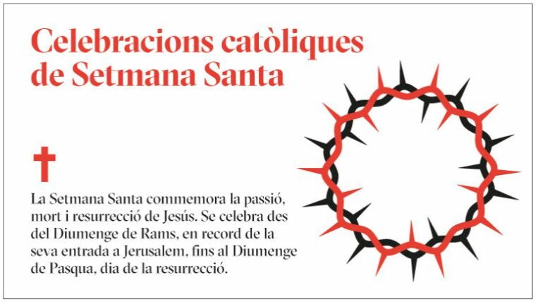 A través de un vasto y rico conjunto de prácticas festivas —procesiones, escenificaciones teatrales y otras actividades litúrgicas y rituales—, la comunidad cristiana recuerda y representa los últimos momentos de Jesucristo en la Tierra, en lo que se conoce como la pasión, la muerte y la resurrección. Este año la Semana Santa (calendario gregoriano) va del 13 al 20 de abril.
