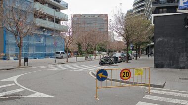 Del 12 al 21 de febrero, los trabajos ocupan la acera y el carril de bajada en el inicio del paseo de Santa Madrona, justo después de girar desde la avenida del Estadi o la de Miramar para bajar hacia Poble-sec. Estos días, en este punto, el paso alternativo de vehículos en uno y otro sentido está regulado manualmente por señalistas. Cuando termina la jornada de trabajo, la circulación se normaliza con un carril abierto para cada sentido.