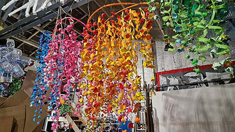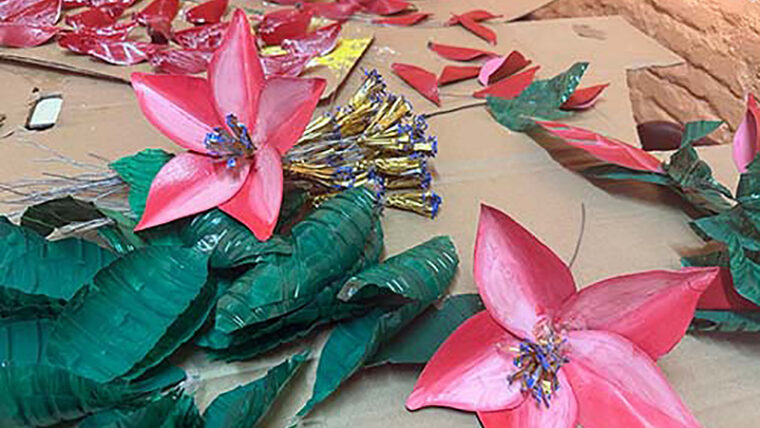 En esta fiesta mayor, la plaza de la Farga tendrá muchas más flores que de costumbre. La Comisión de Fiestas este año no tiene espacio para montar grandes estructuras, pero sí muchísimas flores de cartón, ropa y plásticos reciclados que han pintado de todos los colores. Las macetas gigantes de la portalada darán paso a un techo de plantas trepadoras, muy verde y floral.