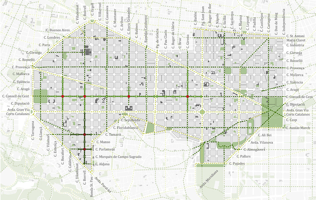 La aplicación del modelo Supermanzanas en la trama Cerdà permite definir una nueva visión y un proyecto de futuro, reorganizando la movilidad general para generar nuevos ejes verdes y nuevas plazas en los cruces. El objetivo es que los ciudadanos del Eixample dispongan de una plaza o un eje verde a 200 metros como máximo, mejorando de forma especialmente significativa la oferta de espacios de encuentro en la zona central de este distrito.